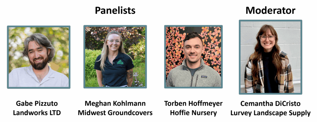 This year’s panel will be moderated by Cemantha DiCristo, Lurvey Landscape Supply and feature Gabe Pizzuto, Landworks LTD; Meghan Kohlmann, Midwest Groundcovers; and Torben Hoffmeyer, Hoffie Nursery, bringing diverse perspectives from across the green industry. Designed as a collaborative conversation rather than a traditional presentation, this event invites attendees to actively participate by asking questions and sharing insights throughout the discussion.