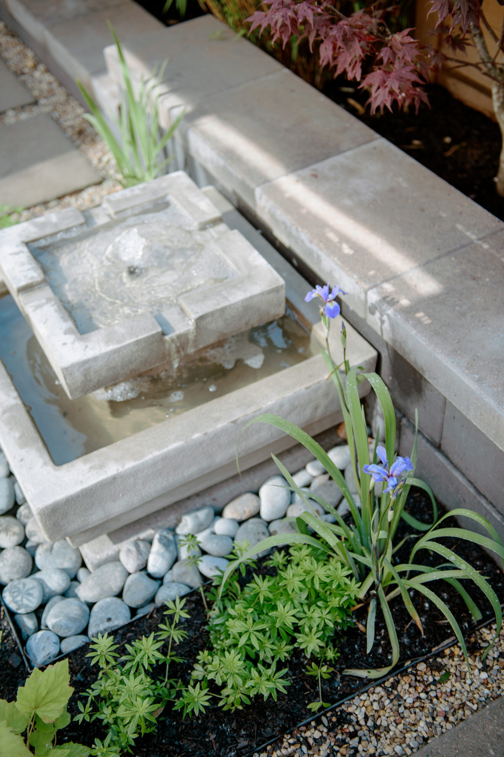 The client sought to reclaim a small, overgrown backyard as the final touch to their home’s transformation. They envisioned a minimalist, mid-century modern look, using foliage for color and texture rather than flowers. The narrow, 11-foot-deep space posed challenges, including a 2-foot grade difference from the back door to the rear elevation. To address this, we designed a streamlined patio with a retaining wall, maximizing usable space and managing the grade. Large square pavers with a bold grid pattern broke up the patio’s length, while a fountain and planting pockets added charm. The result is a seamless indoor-outdoor space that the client loves, with lush plantings they’ll enjoy for years.