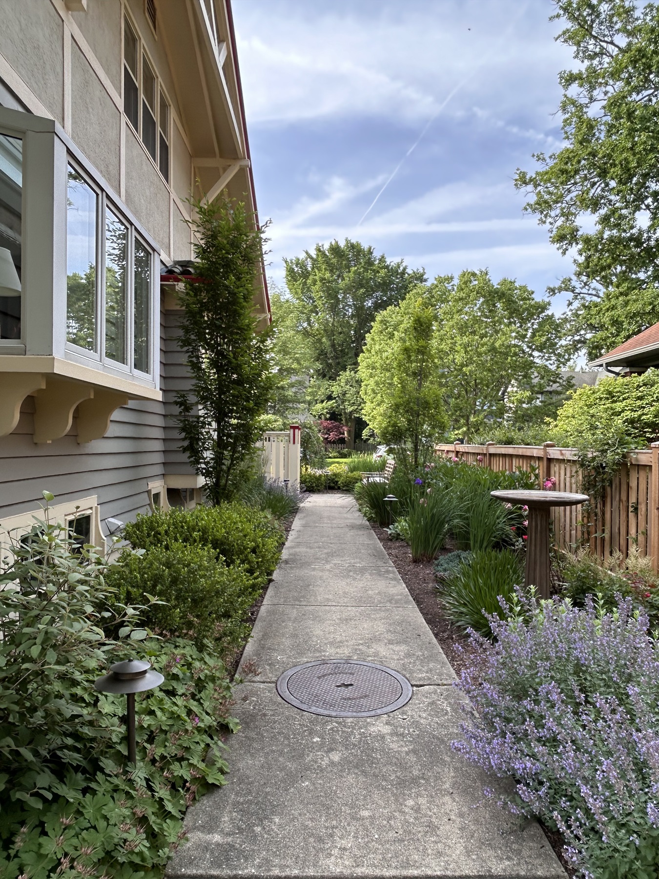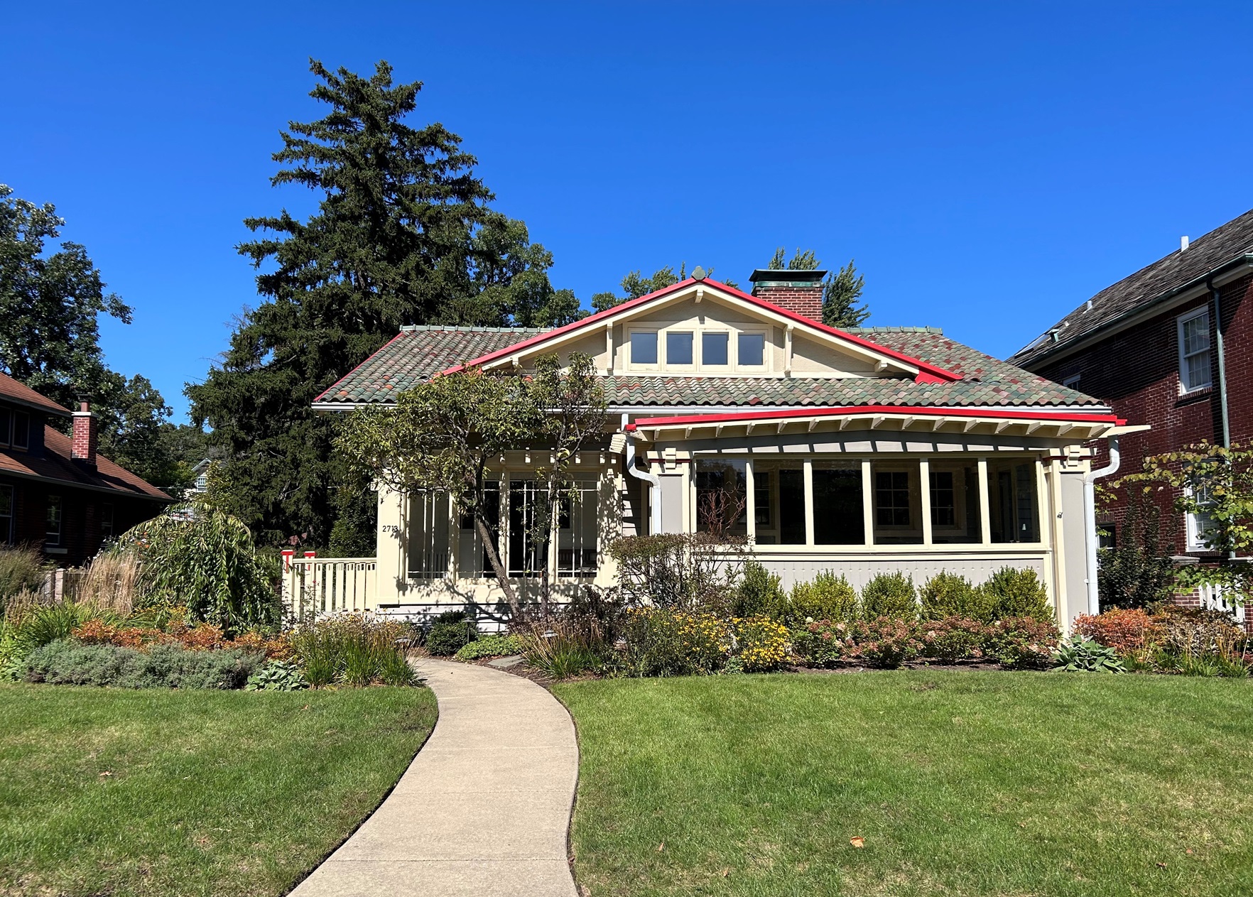 The owners, having recently purchased the home, were eager to personalize the landscape while preserving elements from the previous owner. Although several plants were salvageable, the overall landscape felt disjointed and lacked cohesion. The owners decided to keep the existing concrete walkways, so the planting design needed to soften the harsh straight lines of the paths, fences, and house. With the home’s dramatic architecture as a focal point, the plantings were chosen to enhance the structure. Repeating plantings on either side of the walkway added movement, creating a more dynamic transition through the side yard. The plant palette was carefully selected to complement the home’s bold primary colors while adding texture and depth. Phase one included the side and backyard, and the clients were so thrilled with the results that they proceeded to phase two (the front) just a few months later to complete the vision.