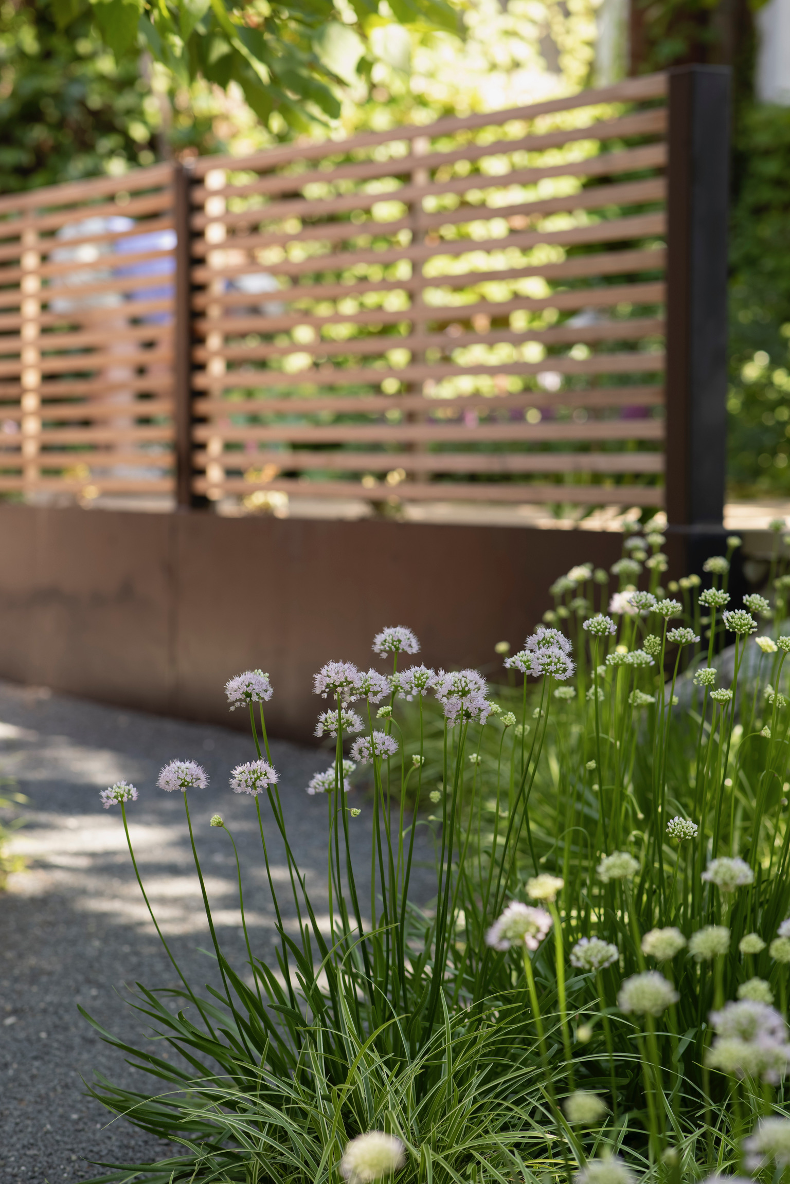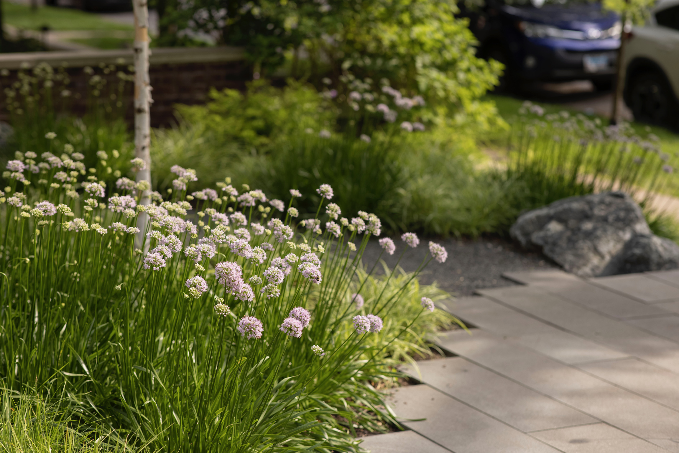 This client came in with a strong design sense and a deep love of the Faroe Islands where they were raised. We worked to translate their inspiration into a striking landscape with regionally appropriate plantings that reflect the client's history and personality. A low, semi-evergreen ground plane of complimentary grasses and sedges creates a flowing, mottled texture reminiscent of the rolling grassy landscape of the Islands, punctuated by seasonal drifts of allium flowers. A small grove of birch trees provides a sense of scale and filtered privacy at the front of the house, while a pair of evergreen trees provide full privacy from the dining room, and creates a magical secret garden in the side courtyard, full of boulders and gravel, where the children can find solace and inspiration in nature.