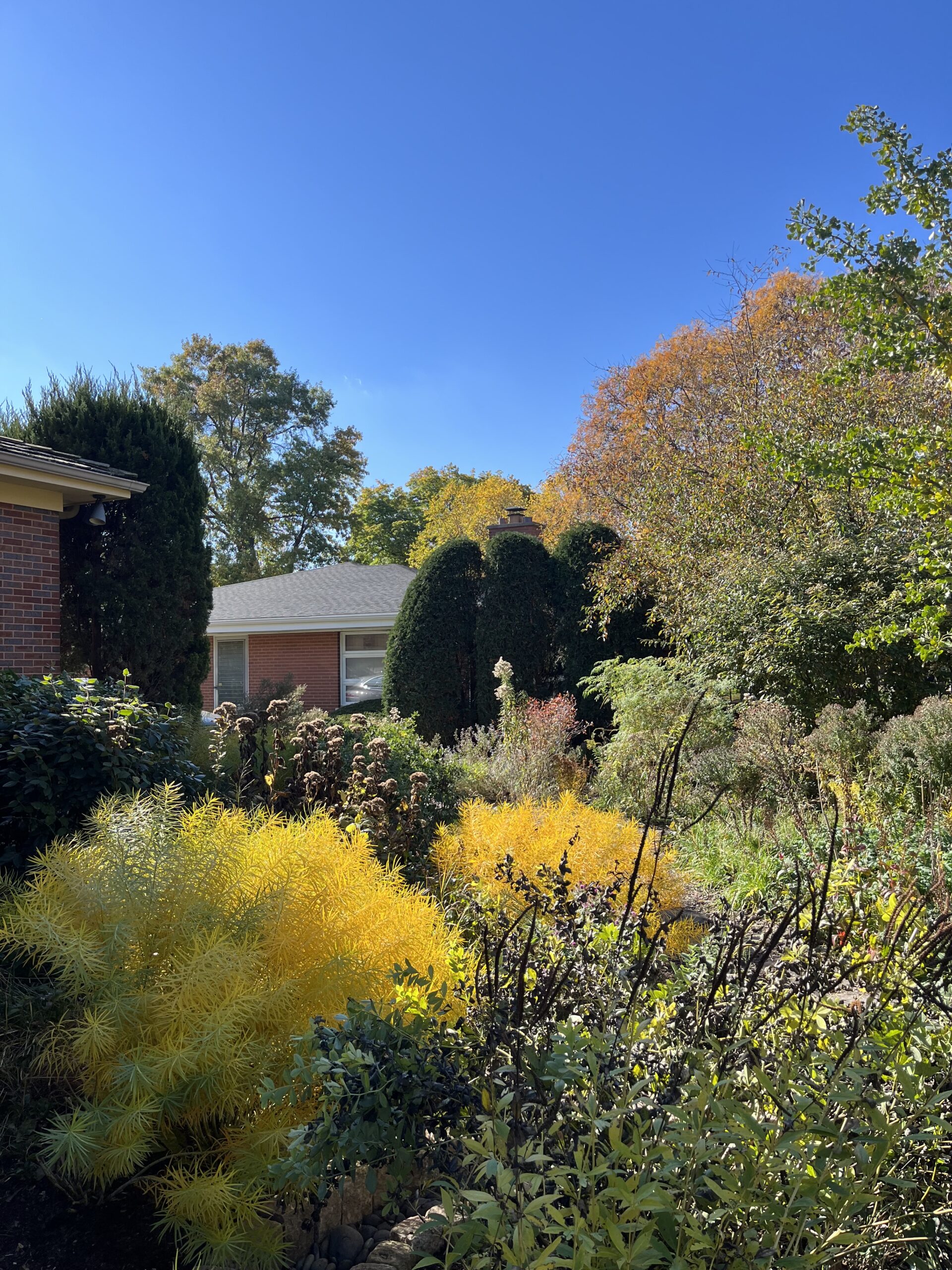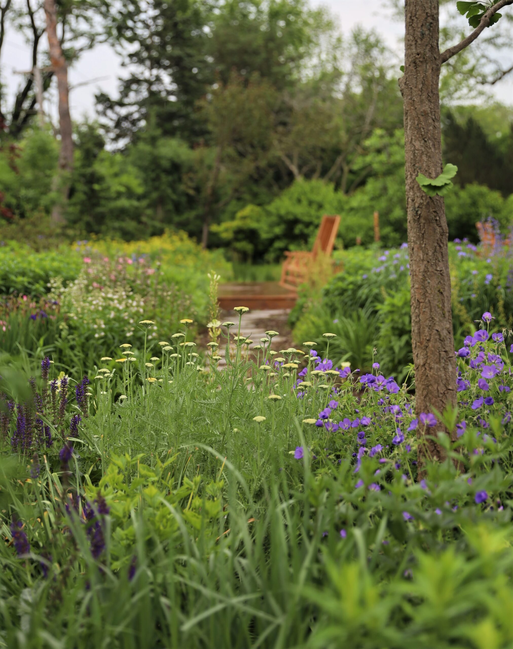 The client is a nature enthusiast and wanted to convert her existing landscape into a haven for pollinators and birds. The first step was to remove the entire lawn and foundation plantings and amend the clay soil with fresh topsoil and compost. The landscape design focused on creating a garden with primarily native plants, walking paths, a drainage runnel, and a new deck where the client can sit and enjoy the view. Birch trees and red cedars were planted along the back of the property to create privacy. A ginkgo tree anchors the center of the space and a blend of prairie grasses and perennials such as amsonia, iris, yarrow, and milkweed add color and structure. A fallen oak tree was repurposed and the trunk cut into 2” thick discs to create a stepper path. The stump of another tree was carved into a sting ray that the grandchildren adore.